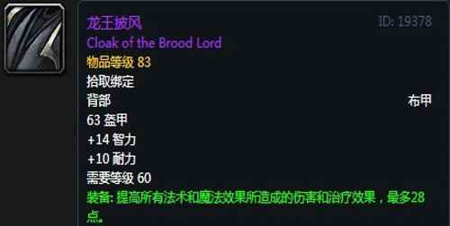 龙王披风:披风,出自黑翼之巢副本奈法利安掉落,推荐附魔强效抗性。 基础属性:63护甲,+14智力,+10耐力,装备效果提高所有法术和魔法效果所造成的伤害和治疗效果,最多28点。
