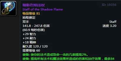 暗影烈焰法杖:双手法杖,出自黑翼之巢奈法利安掉落,推荐附魔法术能量。 基础属性:142-248伤害,攻速3.20,+29智力,+24耐力,+18精神,装备效果使你的法术造成爆击的几率提高2%,提高所有法术和魔法效果所造成的伤害和治疗效果,最多84点。