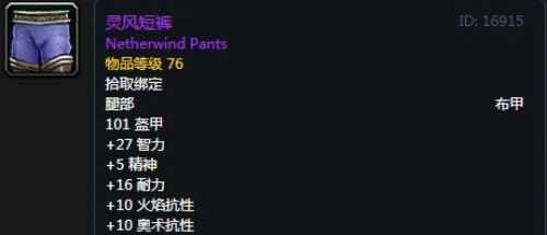 灵风短裤:腿部,出自熔火之心副本拉格纳罗斯掉落,推荐附魔专注秘药。 基础属性:101护甲,+27智力,+16耐力,+5精神,+10奥术抗性,+10火焰抗性,装备效果提高所有法术和魔法效果所造成的伤害和治疗效果,最多30点,使你的法术造成爆击的几率提高1%。 套装属性:(3件套) 组合 : 使你的灼烧、奥术飞弹、火球术和寒冰箭所造成的威胁值降低。 (5件套) 组合 : 使魔爆术、烈焰风暴和暴风雪的攻击范围增加25%。 (8件套) 组合 : 在你施放奥术飞弹、火球术或寒冰箭之后,有10%的几率使你的下一个施法时间少于10秒的法术变成瞬发。