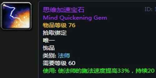 思维加速宝石:饰品2,出自黑翼之巢副本堕落的瓦拉斯塔兹掉落,无法附魔。 基础属性:无基础属性,使用效果使法师的施法速度提高33%,持续20 sec。(5分钟冷却) 魔兽世界社区所有攻略资讯查询方法:1、想要寻找魔兽世界正式服和怀旧服最新攻略、资讯,可以下载安装魔兽世界社区。 2、首先点击下载魔兽世界社区,安卓下载地址:点击查看,IOS下载地址:点击查看,或者直接下载3dmapp,下载地址:点击查看。 3、下载安装app,然后点击app上方搜索关键词,会有相关下拉搜索,选择自己想要的魔兽世界攻略或者资讯,可以点击查看。