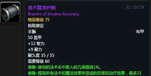 奥术精准护腕:护腕,出自黑翼之巢副本勒什雷尔掉落,推荐附魔强效智力。 基础属性:50护甲,+12智力,+9耐力,装备效果使你的法术击中敌人的几率提高1%,提高所有法术和魔法效果所造成的伤害和治疗效果,最多21点。