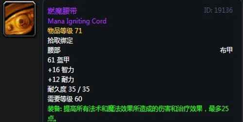 燃魔腰带:腰带,出自熔火之心副本迦顿男爵,玛格曼达,焚化者古雷曼格,加尔掉落,无法附魔。 基础属性:61护甲,+16智力,+12耐力,装备效果提高所有法术和魔法效果所造成的伤害和治疗效果,最多25点,使你的法术造成爆击的几率提高1%。