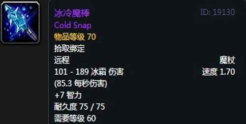 冰冷魔棒:远程武器,出自世界BOSS艾萨拉地图艾索雷葛斯掉落,无法附魔。 基础属性:101-189冰霜伤害,+7智力,攻速1.70,装备效果提高冰霜法术和效果所造成的伤害,提高20点。