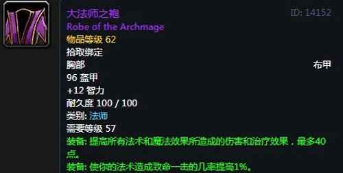 大法师之袍:上衣,出自裁缝专业制作,推荐附魔强效属性。 基础属性:96护甲,+12智力,装备效果提高所有法术和魔法效果所造成的伤害和治疗效果,最多40点,使你的法术造成爆击的几率提高1%,使用效果恢复375 to 625点法力值(5分钟冷却)。