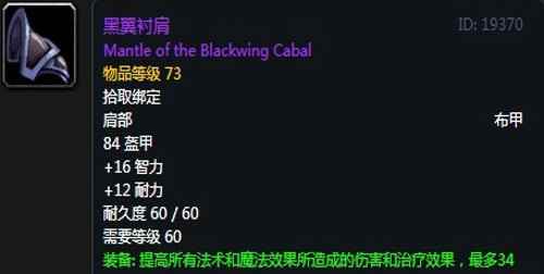黑翼衬肩:肩甲,出自黑翼之巢副本狂野的拉佐格尔掉落,推荐附魔多彩黎明衬肩。 基础属性:84护甲,+16智力,+12耐力,装备效果提高所有法术和魔法效果所造成的伤害和治疗效果,最多34点。