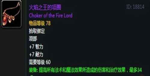 火焰之王的项圈:项链,出自熔火之心副本拉格纳罗斯掉落,无法附魔。 基础属性:+7智力,+7耐力,装备效果提高所有法术和魔法效果所造成的伤害和治疗效果,最多34点。