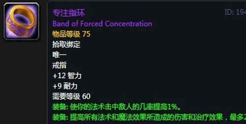 专注指环:戒指2,出自黑翼之巢副本埃博诺克掉落,无法附魔。 基础属性:+12智力,+9耐力,装备效果使你的法术击中敌人的几率提高1%,提高所有法术和魔法效果所造成的伤害和治疗效果,最多21点。