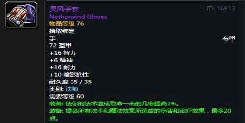 灵风手套:手套,出自黑翼之巢副本埃博诺克,弗莱格尔,费尔默掉落,无法附魔。 基础属性:72护甲,+16智力,+16耐力,+6精神,+10暗影抗性,装备效果使你的法术造成爆击的几率提高1%,提高所有法术和魔法效果所造成的伤害和治疗效果,最多20点。 套装属性:(3件套) 组合 : 使你的灼烧、奥术飞弹、火球术和寒冰箭所造成的威胁值降低。 (5件套) 组合 : 使魔爆术、烈焰风暴和暴风雪的攻击范围增加25%。 (8件套) 组合 : 在你施放奥术飞弹、火球术或寒冰箭之后,有10%的几率使你的下一个施法时间少于10秒的法术变成瞬发。