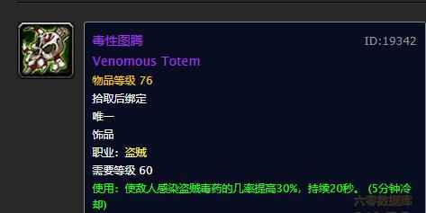 当然,尽管名为“图腾”,但确实不是萨满的饰品,重点还是在于毒性! 诚然,其特效是让敌人感染盗贼毒药的几率提高30%,持续20秒! 不得不说,无论对于哪个天赋的盗贼而言,毒药都是必备的,尤其是刺杀天赋,对于毒药的使用更为频繁!正因如此,这个饰品就是一个20秒的DPS爆发,所以说就算用到60级结束,或者说用到70级,都是毫无压力的!
