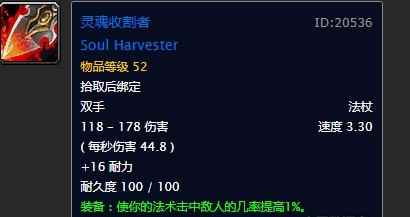 1、灵魂收割者:蓝色品质双手法杖,118-178伤害,攻速3.30,+16耐力,装备效果使你的法术击中敌人的几率提高1%,提高暗影法术和效果所造成的伤害,最多24点。+