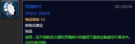 2、深渊碎片:蓝色饰品,使用效果在不消耗法力值和灵魂碎片的情况下施放召唤虚空行者法术(30分钟冷却)。