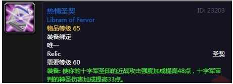 魔兽世界怀旧服热情圣契介绍 名称:热情圣契 拾取绑定 唯一 需要等级 60 装备:使你的十字军圣印的近战攻击强度加成提高48点,十字军审判的神圣伤害加成提高33点。 获得方法 57级以上的小怪掉落,掉率0.01% 魔兽世界社区所有攻略资讯查询方法:1、想要寻找魔兽世界正式服和怀旧服最新攻略、资讯,可以下载安装魔兽世界社区。 2、首先点击下载魔兽世界社区,安卓下载地址:点击查看,IOS下载地址:点击查看,或者直接下载3dmapp,下载地址:点击查看。 3、下载安装app,然后点击app上方搜索关键词,会有相关下拉搜索,选择自己想要的魔兽世界攻略或者资讯,可以点击查看。