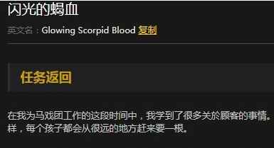 任务需求: 10个发光的蝎血 任务奖励: 20张暗月马戏团奖券 100声望暗月马戏团
