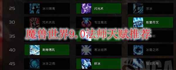魔兽世界9.0法师天赋推荐热能冰,孤寂寒冬、闪光术、能量符文、连锁反应、刺骨寒风、碎冰和热能真空,第三层天赋果不追求极限伤害的话可以选择咒术洪流或专注魔法。一般的话推荐选择能量符文。专注魔法与法阵一起差距不是很大。 魔兽世界14天游戏时间免费领取地址:点击查看