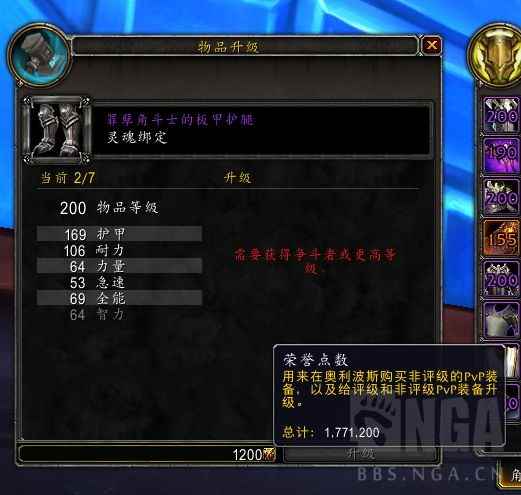 这个可升级的装备,刚买的时候是190,没有任何pvp等级的情况下可以直接用荣誉升一次到200装等,后续再升级需要pvp等级。 等级不够的话会这样: