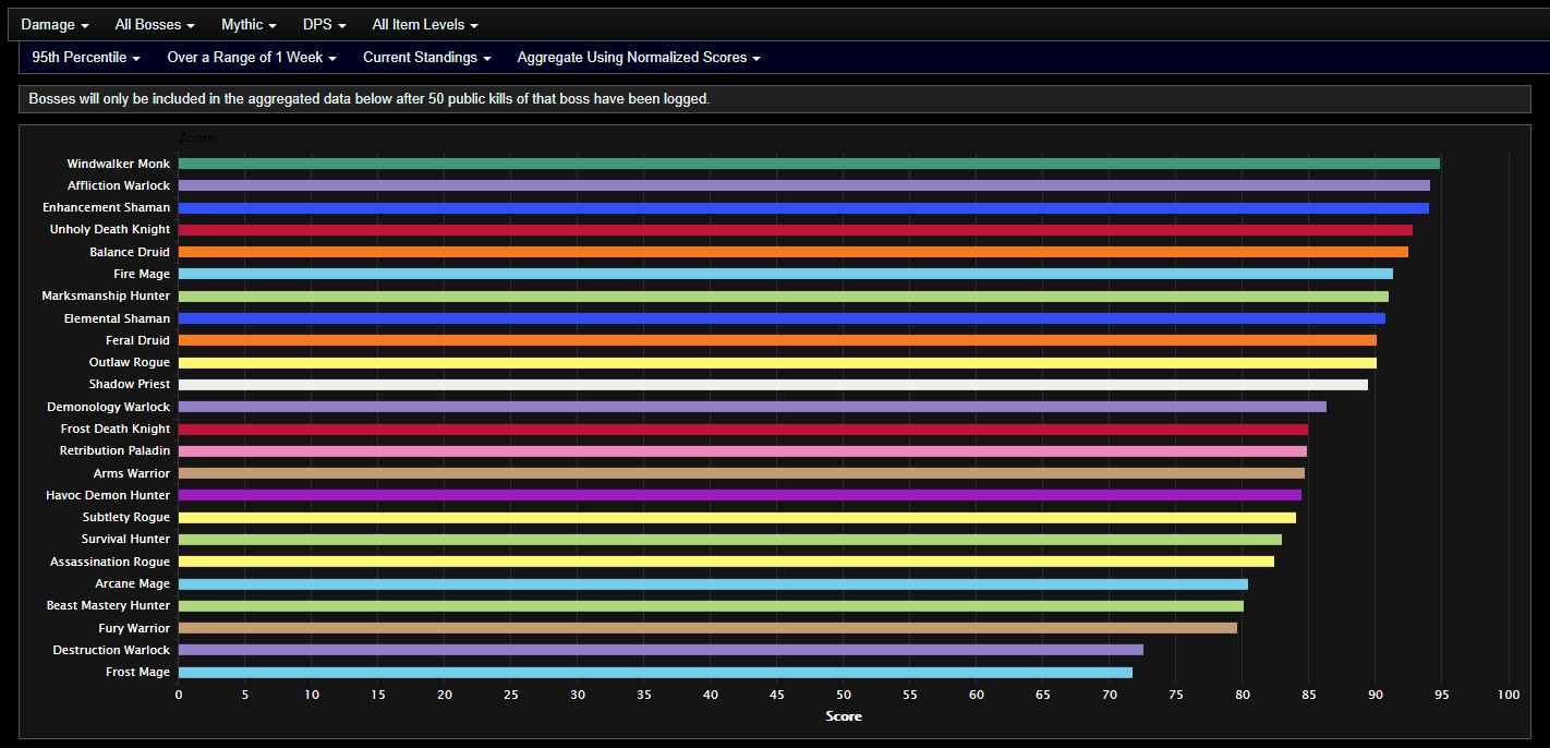 其中有一些作者关于冰DK,兽王猎和其他职业的看法: 冰DK的实际表现比排名要略好一些,主要是因为邪DK的竞争力大于冰DK,过少的样本数计算出的排名有失偏颇,这导致了冰DK的排名浮动非常大。 兽王猎和冰DK有些类似,职业强度本身是尚可的,兽王猎作为副本初期开荒的竞争力很好,但是相应的,上限也没有射击猎那么高。猎人玩家们都更倾向于去玩射击猎,追求更高的上限。 至于增强萨的异军突起是一个BUG,和之前M2奥法的BUG一样,下周就没了。 |