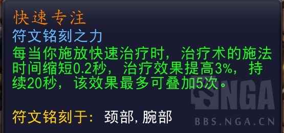 使用快速治疗以后的20秒内(9.05更新),治疗术的施法时间下降0.2秒,治疗效果提升3%,最高叠加5层。 这里推荐做项链,因为手腕有226装绑,入手难度比较低。属性的话按个人喜好来即可,如果想冲高层推荐做暴击急速或者急速全能。 快速专注使得神牧的治疗非常有节奏感,注意全程保持好快速专注5层的buff,如果有移动或者控制或者长度条的话注意提前刷新快速buff。 |