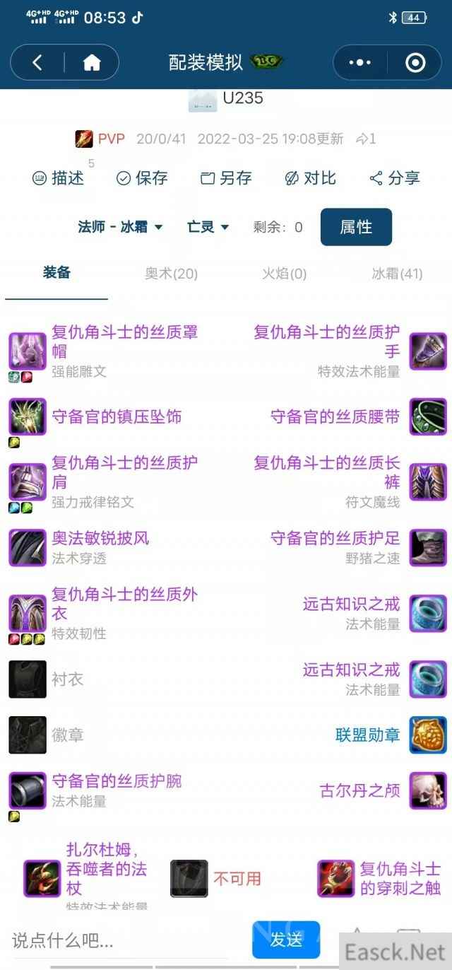 这套装备享受了除护腕以外全套绿甲加持,高智高耐高护甲。 同时插上了珠宝收益最高的18耐力宝石。 外加372韧性、976法伤、18.63%暴击、9.77%急速、3%命中、46装备+10天赋=56穿透。 这是一套完美的55配置装备,如果你打的是菜刀队(如战惩法牧萨、战增法牧德等) 可以把肩膀的18韧性宝石换13穿透,这样你就拥有69穿透。 而多出的1点命中属性,又刚好可以作为距离70差1点穿透的补充。 依旧是最最完美的配装属性。 正常法刀队后期分数够多也可以再买一个肩膀插不同宝石,适配击杀术士的战术。 55更激进一点可以选择和流失岁月项链, 流失岁月在你不是被集火目标时效果特别好。 在22、33或者55的4DPS组合中,你并不需要如此高的韧性。 可以选择把手腕换成思维敏锐护腕,披风换伊利丹的上层精灵斗篷(22/33推荐) 4DPS甚至腰带换BT老2无尽腰带,腿部换海山的元素导能。 根据自己的组合自己的习惯,选择最佳配装。 |