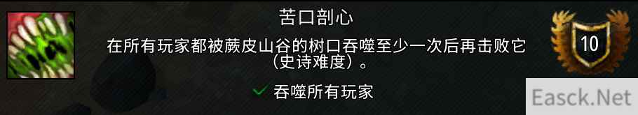这个成就的条件是获得被消化的 debuff,单纯的被吃、用免疫技能躲掉被消化的 debuff,都无法获得成就;必需被吞噬后存活至被吐出来获得被消化的 debuff 为止。 通用作法应该是一次咬一两个人慢慢达成,但直到 11/27 复验,分次被吃还是无法完成成就,必需所有人一起被吃,不知道后续是否会修复。 |
