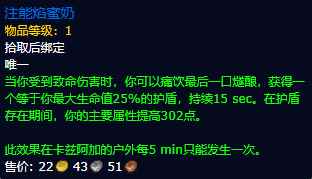 魔兽世界注能燧酿能开出什么注能焰蜜奶 物品等级:1 拾取后绑定 唯一 当你受到致命伤害时,你可以痛饮最后一口燧酿,获得一个等于你最大生命值25%的护盾,持续15 sec。在护盾存在期间,你的主要属性提高302点。 此效果在卡兹阿加的户外每5 min只能发生一次。