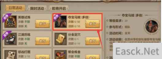 天龙八部手游里面的夺马贼任务是一个非常有意思的活动,小伙伴们可以组队挑战夺马贼,那么天龙八部手游里面的夺马贼任务究竟该怎么玩呢?下面小编就给大家介绍一下天龙八部手游夺宝马贼怎任务玩法,希望能够帮助到大家。 夺宝马贼怎任务玩法