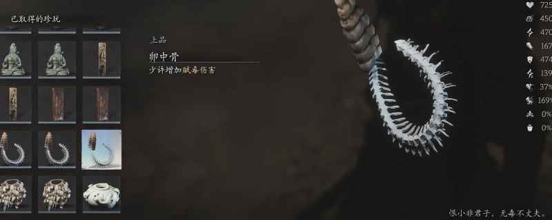 这个珍玩在第四章,盘丝洞中击碎地上的虫卵有概率获得。卵中骨是游戏中的一个珍玩,这个珍玩的品质是上品。效果是少许增加赋毒伤害。