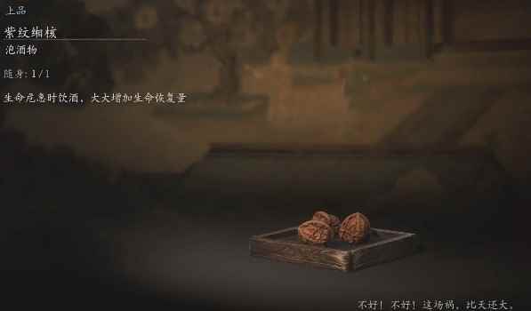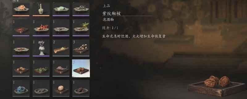 紫纹缃核是游戏中的一个泡酒物,这个泡酒物的品质是上品。这个泡酒物在第四章,在一处有着大喜灯笼的房间内得到,房间内有几个宝箱,最中间的就是。