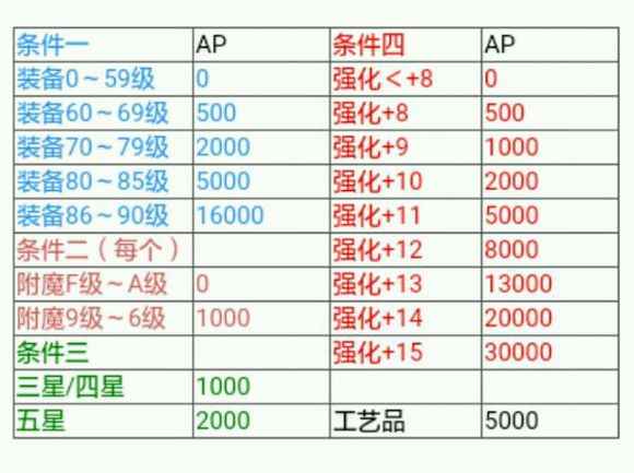 5、赎回装备所需AP 你的装备赎回所需AP,就是把图中符合你装备的不同条件(不同颜色)加起来得出的。