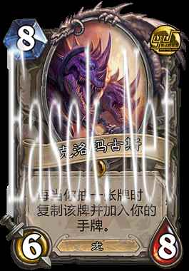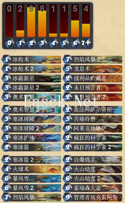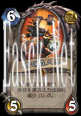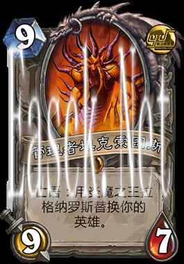 火系卡牌 大多是终结技 末日预言者-和冰霜新星组合,五费清全场。在顶着冰箱的时候也很有用。 龙息术-不确定好不好用。但是我觉得在清场过后应该会发挥作用,尤其是当放在依靠大combo的卡组中的时候。 火山幼龙-与龙息术类似。理论上,这张卡可以增强卡组中期的弹性。 烈焰风暴-带齐两张,利用索瑞森大帝的减费效果,可以消灭对方的小号随从,从而保护变身大螺丝的英雄。而且你也不希望8点伤害打在一个2/3生物上。 阿莱克斯塔萨-理想状态下,你会用红龙喷到对面的英雄,但是如果你已经变身成大螺丝并已经对对方英雄造成伤害了,或者你只有很低的血量时,你可以用红龙喷自己,非常强力。 管理者埃克索图斯-这套卡组的灵魂核心。9攻意味着对面必须马上解掉它。你会因为变身而变得脆弱,只有8点血量;但是你的疯狂科学家应该至少帮你挂上了一个冰箱。挥霍你的英雄技能走向胜利吧。更好的情形是在你自己的回合变身为大螺丝,但是注意一定要提前挂好冰箱。 ![]()