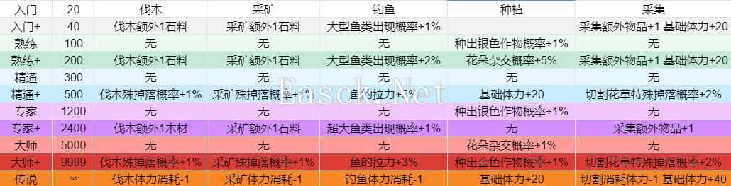 目前关于体力上限增加可能不准。我猜测体力增加条件不止和单个技能的等级有关。例如要增加一个体力,需要2点,把入门+一熟练记1、熟练+一精通记2,只要你把2个入门+技能练到熟练或者1个熟练+练到精通,都会给你加体力上限。 1字多不想看记住只要技能升级就有概率加体力上限就行了。前期大概率升级,越往后给体力的概率越小。 钓鱼经验我猜是钓起的鱼和当前熟练度匹配或者高熟练度加的就多3,9,30,钓鱼熟练度超过鱼的熟练度就只加1,3,5。 |