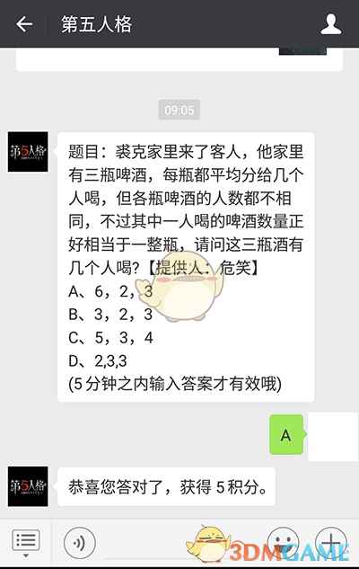 《第五人格》中每日一题是微信上的活动,这次的问题是裘克家里来客人,有三瓶啤酒平均分给几个人喝,而了解人数的问题。不知道答案的小伙伴可以看看下面的答案。