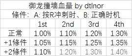 《怪物猎人:崛起》御龙撞墙伤害与血量数值关系表: 先复习一遍世界的算法 dd龙陷阱是固定8%血量 世界撞墙有3档 没有破坏部位=2% 破坏了一个部位=2.5% 破坏了两个部位以上=3% 而在mhrise里面也与血量有关, 并且取决于一次御龙中的第几次撞墙(以1%开始,每多一次+0.1%), 撞墙的时候是否有按R冲刺(条件A,符合就+0.05%), 以及是否在一个“合适的时机”(条件B,符合就+0.05%)。 这个“合适的时机”我推测是操龙经过了(冲刺了)一定的时间后就会达成条件。 但因为第二次撞墙开始,时间上有限制(如果不在短时间内撞墙就会自动脱离御龙) 所以至今没有观察到第二次以上同时符合两个条件的情况。只有第一次撞墙可以做到。 (你可以试试操龙的时候怼着墙按R冲刺一段时间再撞墙,应该就是满足2个条件的伤害了)