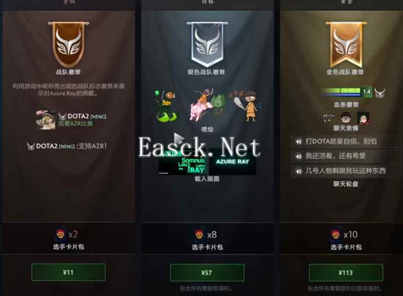 dota2AR战队应援团内容可以见上图,分为三个档位,价格为11、57、113. |