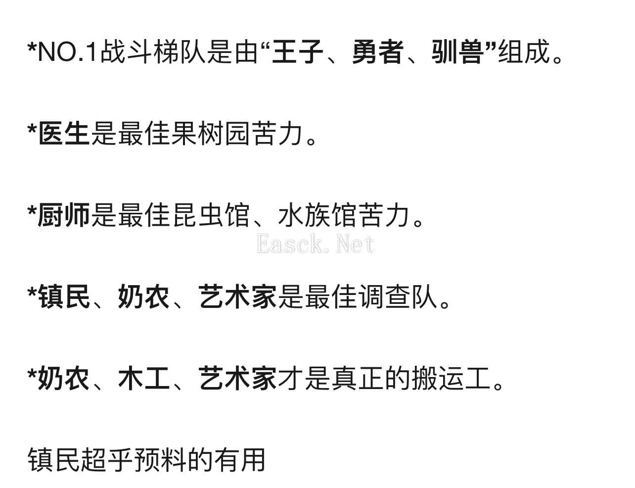 *NO.1战斗梯队是由“王子、勇者、驯兽”组成。 *医生是最佳果树园苦力。 *厨师是最佳昆虫馆、水族馆苦力。 *镇民、奶农、艺术家是最佳调查队。 *奶农、木工、艺术家才是真正的搬运工。 镇民超乎预料的有用 以上就是小编整理带来的王都创世录二代相性表,二代相性攻略,更多精彩内容,请点击关注手游网! |