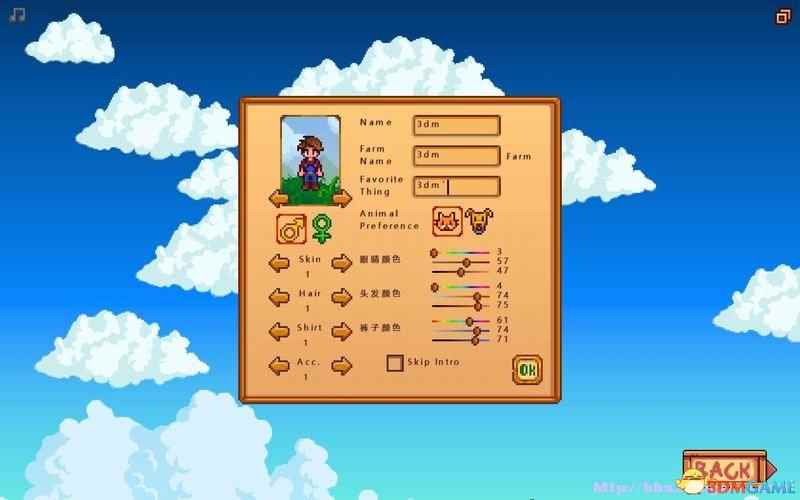 玩家可以简单的自定义主角外形、性别和名字。 可以在这个界面选择Skip intro来跳过介绍,直接开始游戏。