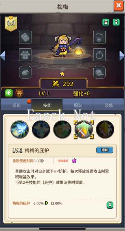 技能4:被动技能-梅梅的庇护 冷却时间:0.0秒 解锁条件:1紫星 技能效果:普通攻击时对自身赋予HP防护。每次释放普通攻击时累积增盆效果,当第2号技能的【庇护】效果消失时重置。 梅梅的庇护:6.00%▷12.00% 应用策略:此被动技能在普通攻击时提供HP防护增益效果,适合在频繁使用普通攻击时保持高效的防护能力。
