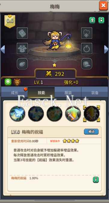 技能5:被动技能-梅梅的祝福 冷却时间:0.0秒 解锁条件:4黄星 技能效果:普通攻击时对自身赋予增加躲避率增益效果,每次释放普通攻击时累计增益效果,当第3号技能的【祝福】效果消失时重置。 应用策略:此被动技能在普通攻击时提供躲避率增益效果,适合在频繁使用普通攻击时保持高效的躲避能力,减少受到的伤害。