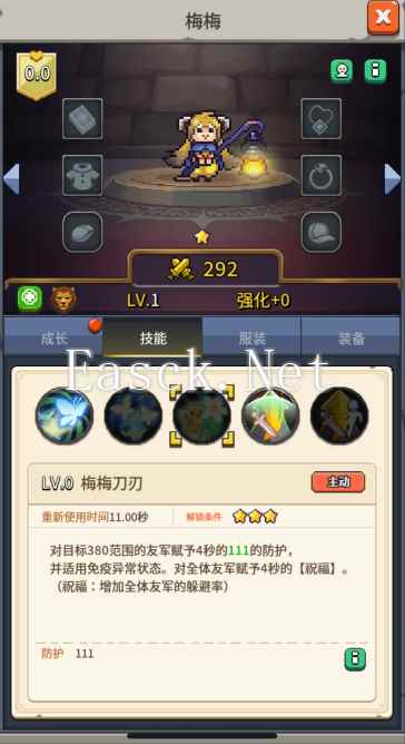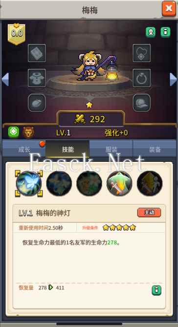 《飞碟快闪》梅梅技能及应对策略技能1:主动技能-梅梅的神灯 冷却时间:2.5秒 解锁条件:5黄星 技能效果:恢复生命力最低的1名友军的生命力278。 恢复量:278▷411 应用策略:此技能适用于快速恢复生命力最低的队友,短冷却时间使其在战斗中可以频繁使用,确保队友的生存能力。