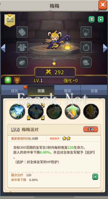 技能2:主动技能-梅梅派对 冷却时间:6秒 解锁条件:2黄星 技能效果:目标380范围的友军在3秒内每秒恢复120生命力,敌人的命中率下降6.00%。并且对全体友军赋予【庇护】(庇护:对全体友军的HP防护) 圆点治疗:120 命中率下降:6.00% 应用策略:此技能在群体战斗中非常有效,能够为范围内的友军提供持续治疗,并降低敌人的命中率,适合在战斗初期使用以维持团队的生命值。