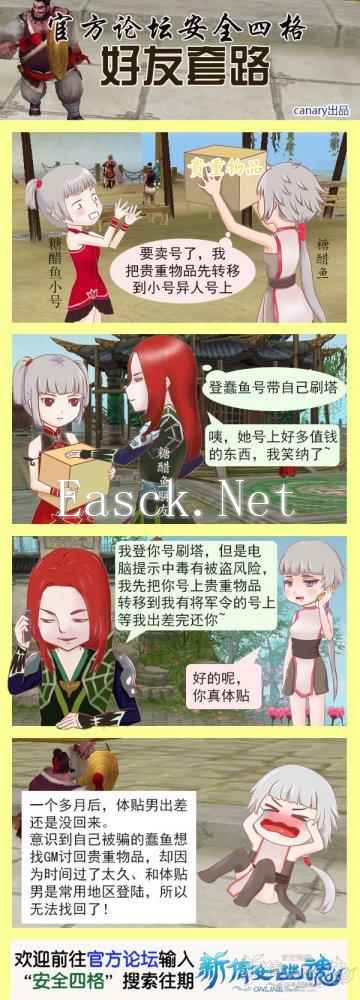 倩女安全四格漫画,呆萌蠢鱼深陷好友套路,一起来看看吧。 糖醋鱼的偃师要上cbg,她把偃师号上的贵重物品(比如吴山石宝石精粹钥匙。。)转移到她小号异人仓库里。 “好友”经常登她的异人号带刷塔,“好友”发现糖醋鱼异人号上多了这么多好东西,马上占为己有,交易给自己的号。 糖醋鱼发现号上东西不见后,好友谎称自己电脑中毒,怕糖醋鱼被盗号,所以先把东西转移到有将军令的小号,并称自己在出差,目的是稳住糖醋鱼拖时间。 蠢鱼居然信了! 等糖醋鱼恍然大悟终于决定找GM了,却无法找回:超时了。他是常用地区登录。 ![]() 防骗TIPS: 1、账号不要经常借给别人!长得帅也不行! 2、谨慎识别骗子话中漏洞,如:电脑中毒为何还能登大号??? 3、贵重物品丢失尽快在第一时间找GM,拖太长时间会导致无法找回。 |
