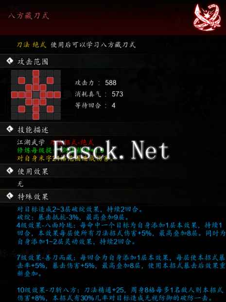 特殊效果 破绽:暴击抵抗-3%,最高查加9层。 4级效果-八面玲珑:只要命中目标之后就能增加上加1层本效果,能持续一个回合。 所有刀法伤害+5%,最高叠加8层,还能为自身增加加1~2层灵动效果,持续2回合。 7级效果-善刀而藏:每层使本招式暴击率+5%,暴击伤害+5%,最高叠加8层。 10级效果-刀斩八方:刀法精通+25,伤害+8%,对目标能造成无视防御的伤害。