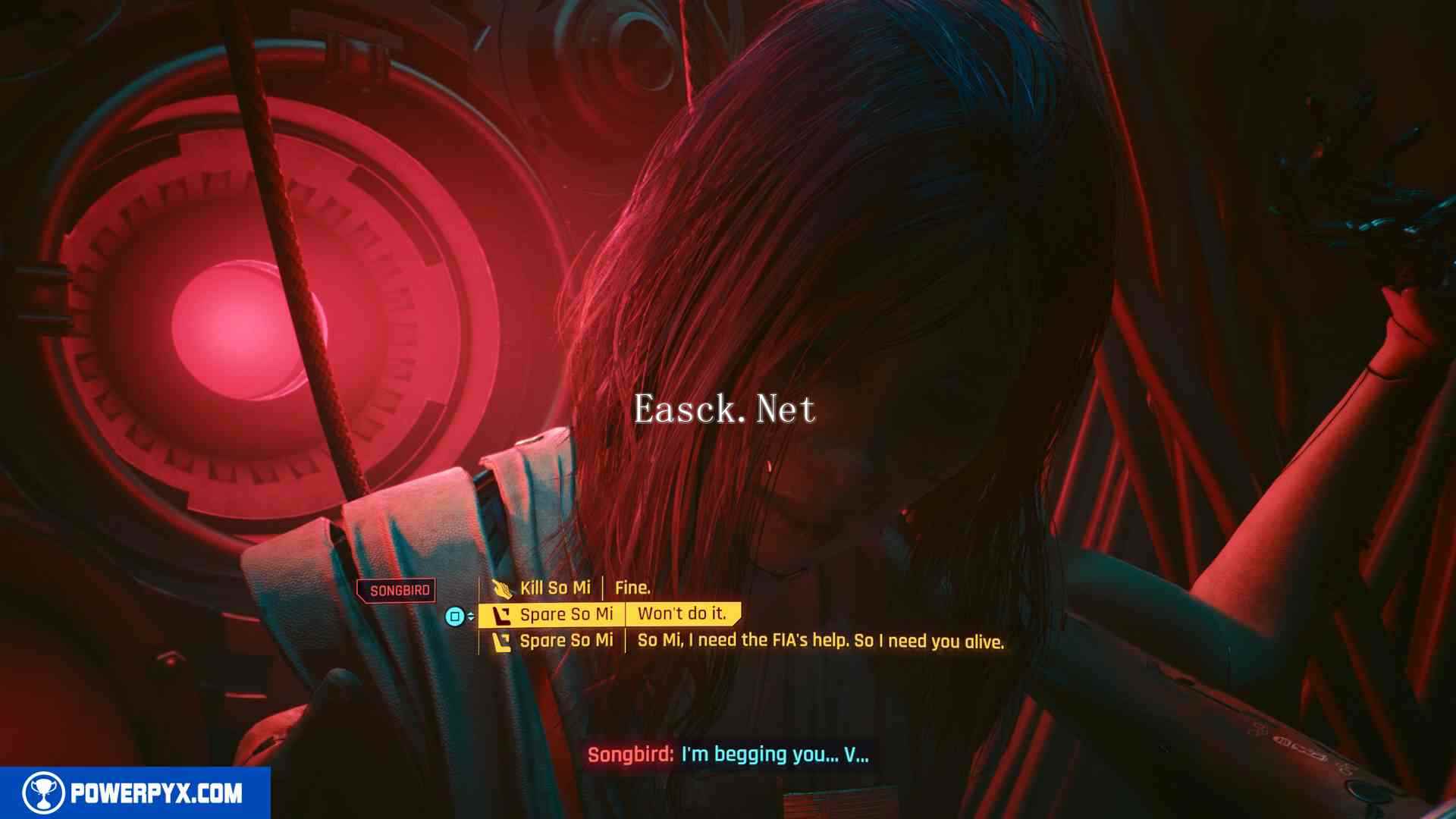 继续播放故事的其余部分。剩下的选择并不重要,奖杯将在“主要工作:沉默中离开”中解锁,在 V 的公寓里与约翰尼交谈后。 获得此奖杯后,您可以从“主要工作:有些损坏”中重新加载手动保存(或自动保存),并杀死鸣鸟以获得相反的奖杯之奖杯王。 |