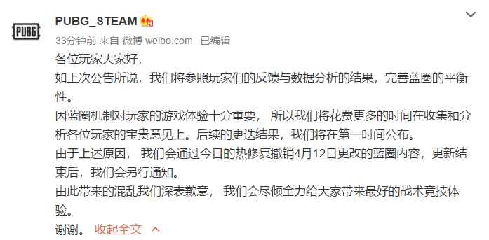 在4.12日蓝洞对毒圈进行了全面的改动,然而毒圈的改动却迎来了很多玩家的不瞒,都不能适应新版毒圈的变化,那么到底这次改动的具体内容是什么呢?撤回的原因是什么跟着小编来看看吧! 因蓝圈机制对玩家的游戏体验十分重要, 所以我们将花费更多的时间在收集和分析各位玩家的宝贵意见上。后续的更迭结果,我们将在第一时间公布。由于上述原因, 我们会通过今日的热修复撤销4月12日更改的蓝圈内容,更新结束后,我们会另行通知。 由此带来的混乱我们深表歉意, 我们会尽倾全力给大家带来最好的战术竞技体验。