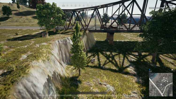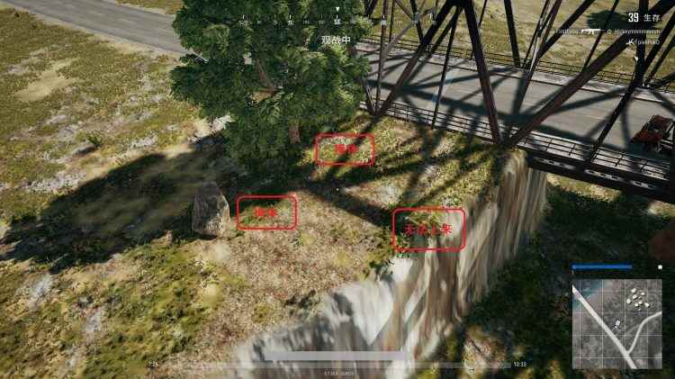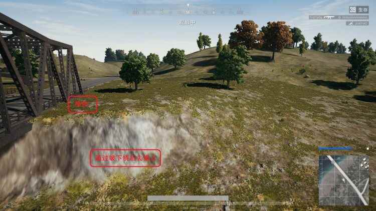而2这个位置,因为有一个小的山坡,所以大概率也会有人,3的房区也很有可能会有人,而且即使没有人,桥头的敌人也会选择转点到3的位置。 所以当我们判断了敌人大概的位置后,我们也转移到了安全区内,我们应该做什么呢? 这个时候最忌讳的,便是所有人高高兴兴的拿着枪在打桥头敌人的靶子。 在游戏的这个阶段,很多玩家这时候基本也是标准的步枪+狙击枪的配置,这时候身在1这片区域的玩家,一眼就能看到桥头的敌人,然后高高兴兴的开始了打靶游戏。这个时候,可能有些细致的玩家会留一个人来负责看近点。 那么这个时候,我们问题来了,我们会不会被背后的敌人偷?