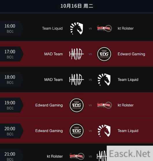 第六天 10月16日:第七天 16:00 TL-VS-KT 17:00 MAD-VS-EDG 18:00 MAD-VS-TL 19:00 EDG-VS-KT 20:00 EDG-VS-TL 21:00 KT-VS-MAD