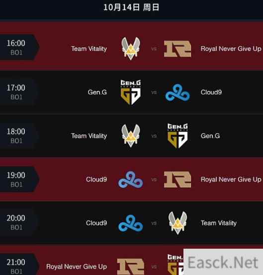 第四天 10月14日:第五天 16:00 VIT-VS-RNG 17:00 Gen.G-VS-C9 18:00 VIT-VS-Gen.G 19:00 C9-VS-RNG 20:00 C9-VS-VIT 21:00 RNG-VS-Gen.G