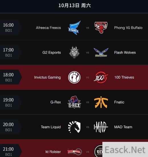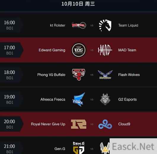 第三天 10月13日:第四天 16:00 AFS-VS-PVB 17:00 G2-VS-FW 18:00 IG-VS-100 19:00 GRX-VS-FNC 20:00 TL-VS-MAD 21:00 KT-VS-EDG