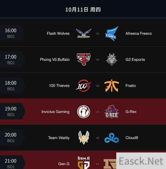 第一天 10月11日:第二天 16:00 FW-VS-AFS 17:00 PVB-VS-G2 18:00 100-VS-FNC 19:00 IG-VS-GRX 20:00 VIT-VS-C9 21:00 Gen.G-VS-RNG