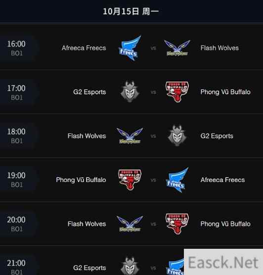 第五天 10月15日:第六天 16:00 AFS-VS-FW 17:00 G2-VS-PVB 18:00 FW-VS-G2 19:00 PVB-VS-AFS 20:00 FW-VS-PVB 21:00 G2-VS-AFS