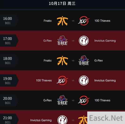 第七天 10月17日:第八天 16:00 FNC-VS-100 17:00 GRX-VS-IG 18:00 PVB-VS-FW 19:00 AFS-VS-G2 20:00 RNG-VS-C9 21:00 Gen.G-VS-VIT